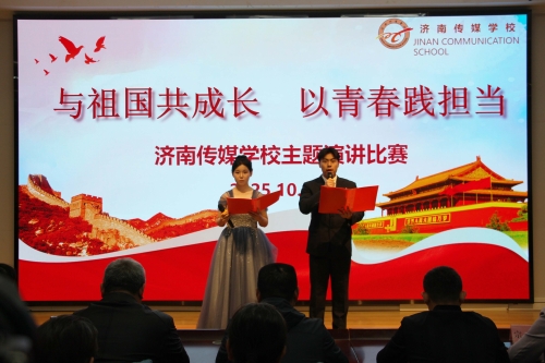 此次演讲比赛意义非凡——济南传媒学校所在地曾是抗日战争时期新华院集中营旧址,如今已成为传递红色记忆的爱国主义教育基地。随着主持人饱含深情的开场白,比赛正式拉开帷幕。18位选手依次登台,以“烽烟记忆・山河壮歌”、“精神如炬・薪火相传”、“青春逐梦・躬行担当”、“与国同行・共赴荣光”为脉络,用声音编织起历史与当下的纽带。
