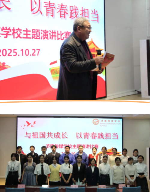 为庆祝反法西斯胜利 80 周年,引导传媒学子铭记历史、勇担青春使命,济南传媒学校在道德讲堂隆重举办“与祖国共成长,以青春践担当”主题演讲比赛。学校领导、语文教研组评委团队及师生代表齐聚一堂,共同参与这场融红色历史与传媒特色于一体的青春盛会。