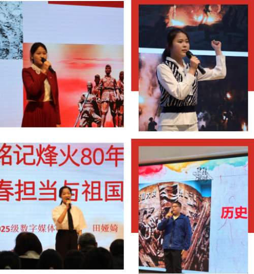 24高考4班的刘畅率先登场,一句“烽火岁月里的赤诚,是先烈留给我们最珍贵的遗产”,瞬间将听众拉回那个山河飘摇却信念如钢的年代;25 动大的张欣然握着话筒眼中闪光,“我是动漫专业的学生,我要把先烈的故事画进漫画,让红色形象走进课堂,走进年轻一代的心里”,话语里满是传媒学子的独特思考。