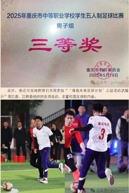 (三)点亮特色,打造校园“新名片” 结合学校足球特色发展的要求,熊剑重组武隆区职业教育中心学生男子足球队,担任教练。经过两个半月的科学备战,他带领球队在2025年重庆市中等职业学校学生五人制足球比赛中,从30余支队伍中杀出重围,挺进16强,实现了学校足球赛事奖项的历史性突破。  三、聚力团队战,传递协作“好声音” 在济南协作武隆教育团队领队张纪余的指导下,熊剑充分发挥传媒专业特长,牵头梳理团队在提升教育质量、帮扶旅游经济、展现协作风采、彰显教育情怀等方面的工作成果,组织撰写并发布宣传稿件73篇。带领团队成员制作了《我们的献礼》和《渝见》两部短视频,生动呈现了济南协作武隆团队教育工作者的丰硕教育成果,让鲁渝教育协作的故事被更多人知晓,为两地教育交流搭建了良好的宣传桥梁。