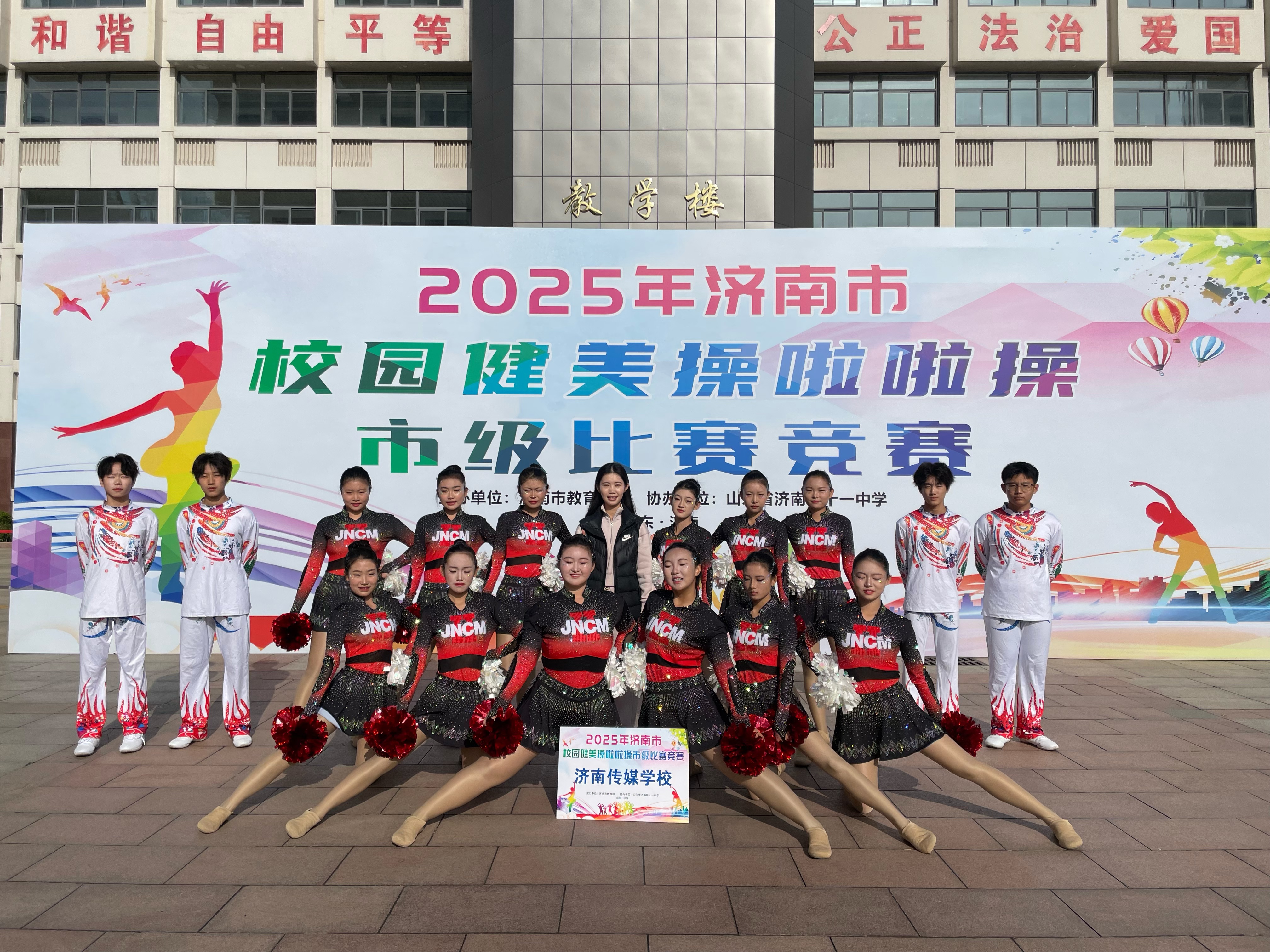 2025年11月8日-9日,济南市校园健美操啦啦操比赛火热开赛,全市111所学校的1556名学生同台竞技、各展风采。济南传媒学校健美操队的16名学子凭借过硬实力脱颖而出,一举斩获职专组花球啦啦操一等奖与健身操二等奖,为学校赢得荣誉。
