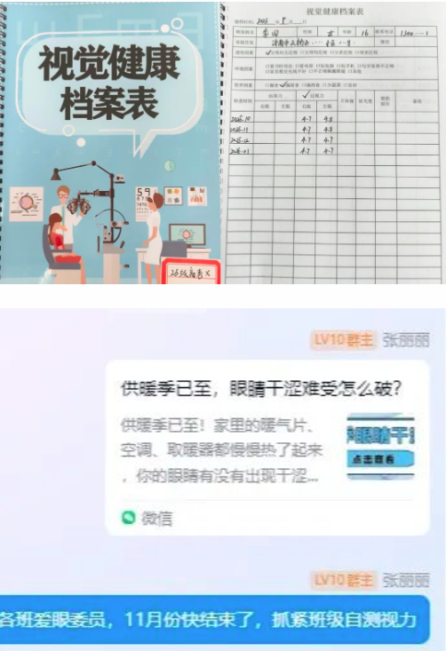 “六个一”工程筑牢防控根基 学校将近视防控工作常态化、系统化,扎实推进“六个一”工程落地见效。每天上下午各安排一次眼保健操,在校医与班主任的监督指导下,确保学生动作规范、穴位准确;为每个班级配备视力检测表、眼保健操分解图及检测工具,定期检查补充;每月组织班级自测视力,建立学生个人视力健康档案,实现动态监测与早发现、早预警;每学期初通过班主任会联动德育校长、学生发展部及校医室,开展视力专题部署会,明确责任分工;每季度以手抄报、知识问卷调查、短视频等学生喜闻乐见的形式,开展爱眼宣教活动;每学年由德育校长牵头,系统分析全校学生视力状况,汇总防控工作形成年度报告,从多维度为学生视力健康筑牢防护网。