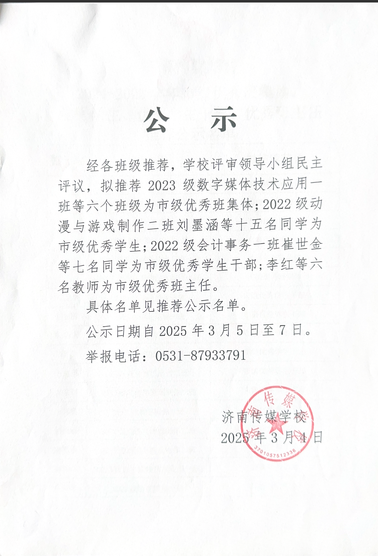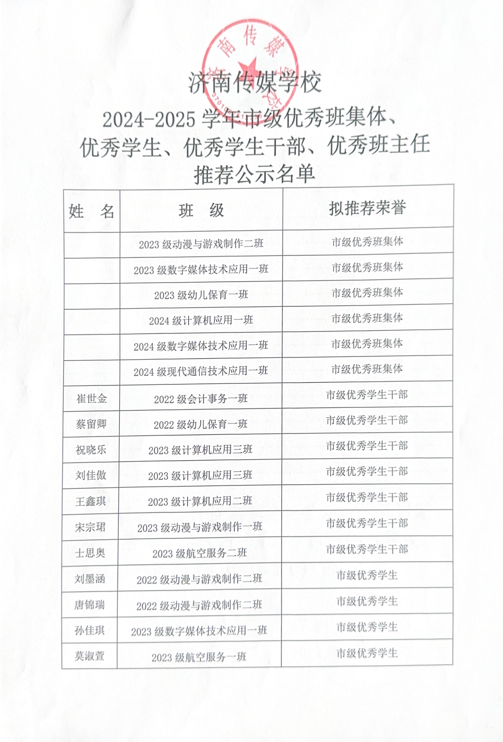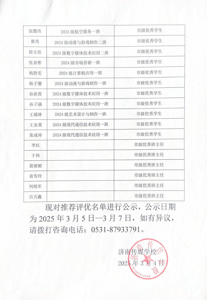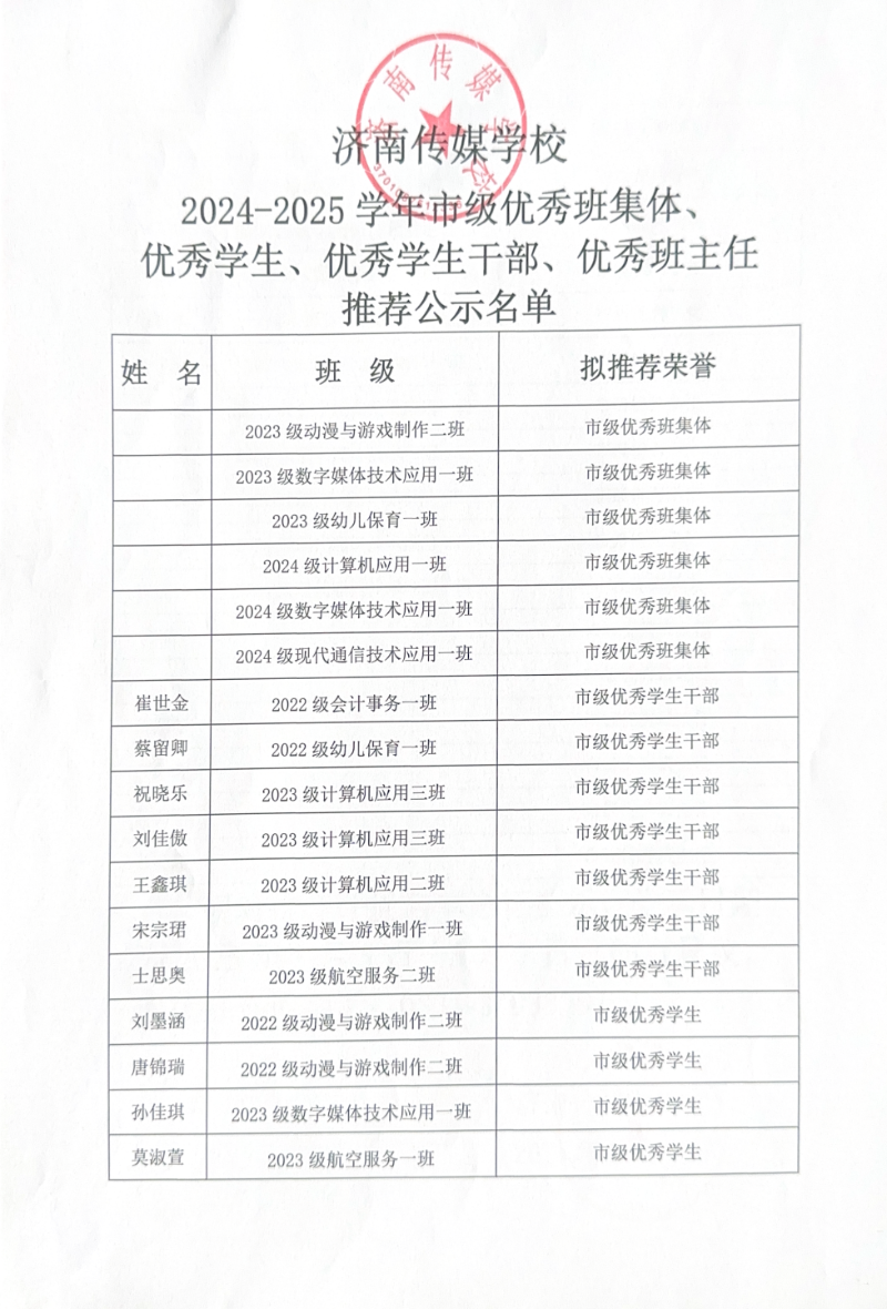 济南传媒学校2024-2025学年度市级优秀班集体、优秀学生、优秀学生干部推荐公示名单