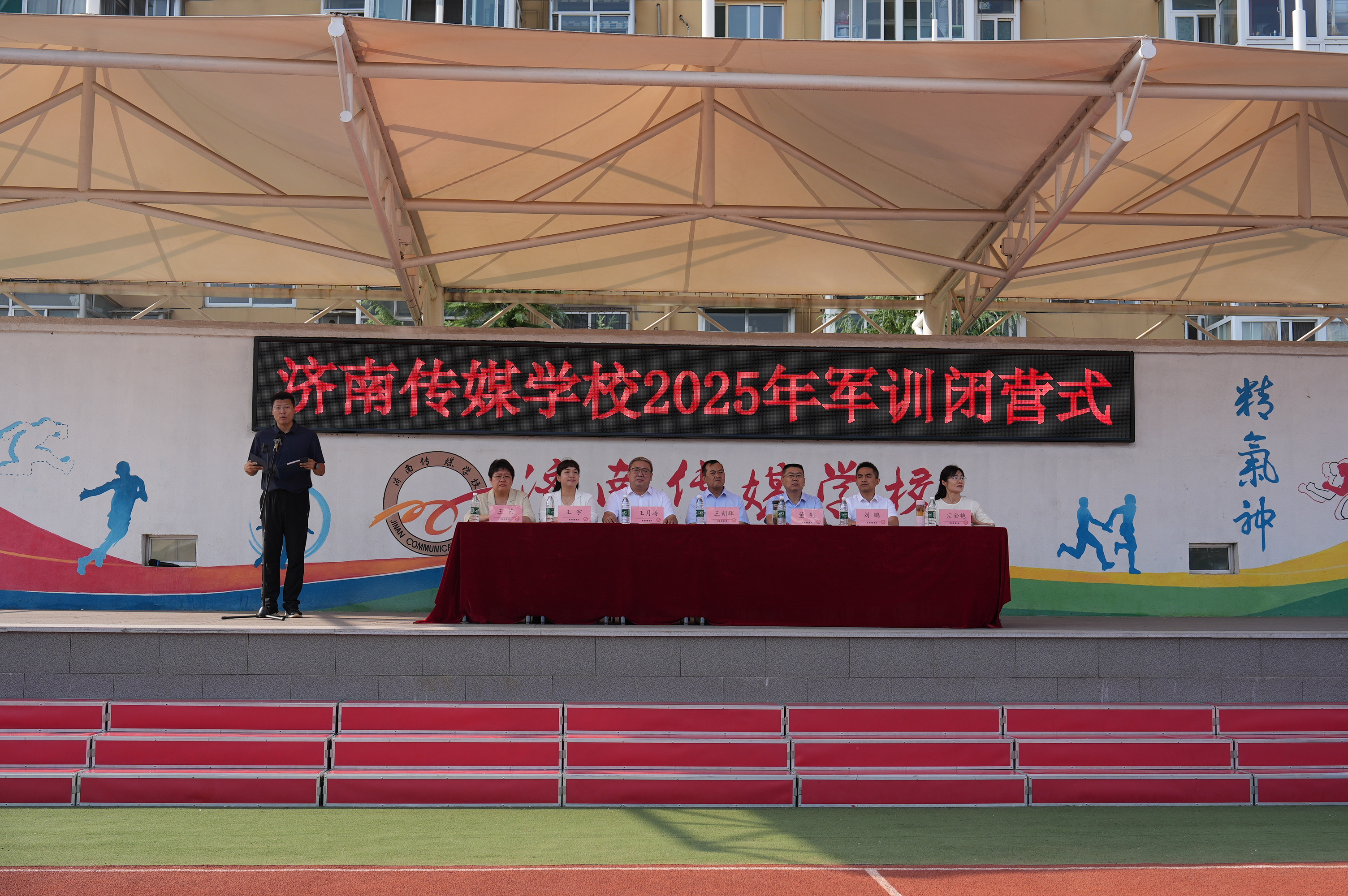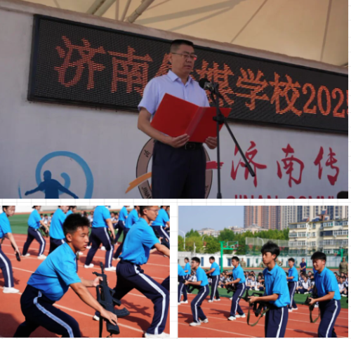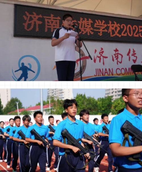 9月14日上午,济南传媒学校2025级新生军训闭营式暨军训汇报展演在操场举行。学校党总支书记董钊,党总支副书记、校长王月涛,济南市天桥区人武部民兵训练基地主任王朝辉,济南传媒学校副校长刘鹏、王宇、宗金艳,学生发展部主任王艺出席仪式,本次活动特邀2025级新生家长共同见证2025级新生7天军训的成长蜕变。