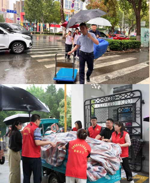清晨,志愿者已在校门、宿舍区布点,备好雨具与推车。雨势变大后,党总支书记董钊,骑上了三轮车为学生运送行李;校长王月涛,扯起防雨布护住学生的被褥。党员教师们紧随其后:有的党徽别在湿透的衣襟上,仍扛着行李箱蹚过水洼;有的一手撑伞护学生,一手扶着行李车;宿舍楼下,核对信息的党员教师指尖沾着雨水,党徽却格外醒目。