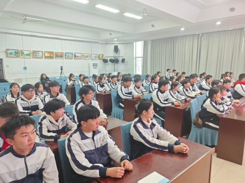 活动当天,讲座以“学法懂法,知法守法”为核心,通过“主会场+教室分会场”的形式同步开展。主会场内,陈所长结合真实案例,围绕校园常见的矛盾纠纷、网络安全、公共秩序维护等内容,解读《中华人民共和国治安管理处罚法》中与青少年密切相关的条款,清晰阐明违法行为的法律后果。教室分会场的各班学生通过多媒体设备同步观看直播,全程专注聆听、认真记录。