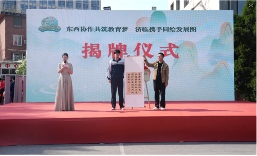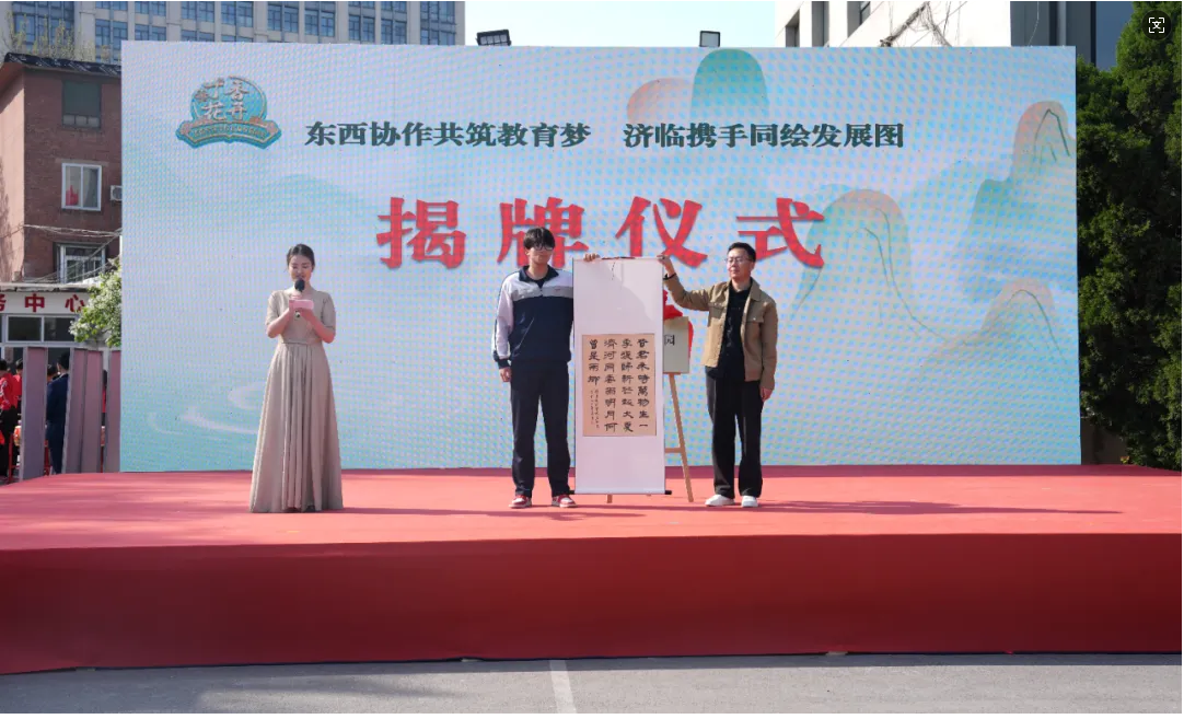 活动上,还隆重举行了“匠心锦绣园”揭牌仪式。2023年6月,济南传媒学校与临夏州职业技术学校签署战略合作框架协议,临夏州职业技术学校先后派三位干部到济南传媒学校挂职交流。今年,临夏州职业技术学校赠送西北特有牡丹品种群,国家Ⅱ级重点保护珍稀濒危植物——甘肃紫斑牡丹,在传媒校园建成“匠心锦绣园”,济南传媒学校党总支书记董钊、临夏州职业技术学校马祥军主任共同为牡丹园揭牌。同时,学生左乐天书写一幅书法作品,在揭牌仪式上赠送给马祥军主任。