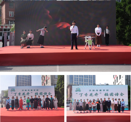 本次诗会的文艺汇演节目形式多样、精彩纷呈。饱含深情的朗诵,将丁香花与校园的美好展现得淋漓尽致,带领观众走进花香四溢的诗意世界。大鼓队的表演气势磅礴,激昂的鼓点如雷霆般响彻校园,展现了同学们的青春活力。情景剧表演穿越时空,对话先贤,诉说承先贤教诲,筑中华复兴之梦的志向。一纸家书,承载游子的牵挂、父母的叮咛,表达传媒人的家国情怀。歌曲《玉盘》和《苔》旋律悠扬,诠释了坚持行动,敢于筑梦的豪情满怀。教师诗朗诵,展现了师者的赤诚之心与对学生的殷切期盼。