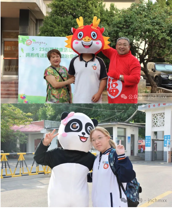 清晨的校园里,平日严肃的校领导们早早换上毛绒人偶服装,化身充满童趣的卡通角色,站在校门口迎着朝阳欢迎同学们。威武的“中国龙”人偶轻拍同学肩膀, “老虎”竖着大拇指鼓励同学们,“敖丙”温柔弯腰拥抱,熊猫则憨态可掬的与同学们拥抱。许多同学从最初的惊讶、害羞,到欣然接受拥抱,甚至主动与人偶击掌、合影,校园里洋溢着欢声笑语。